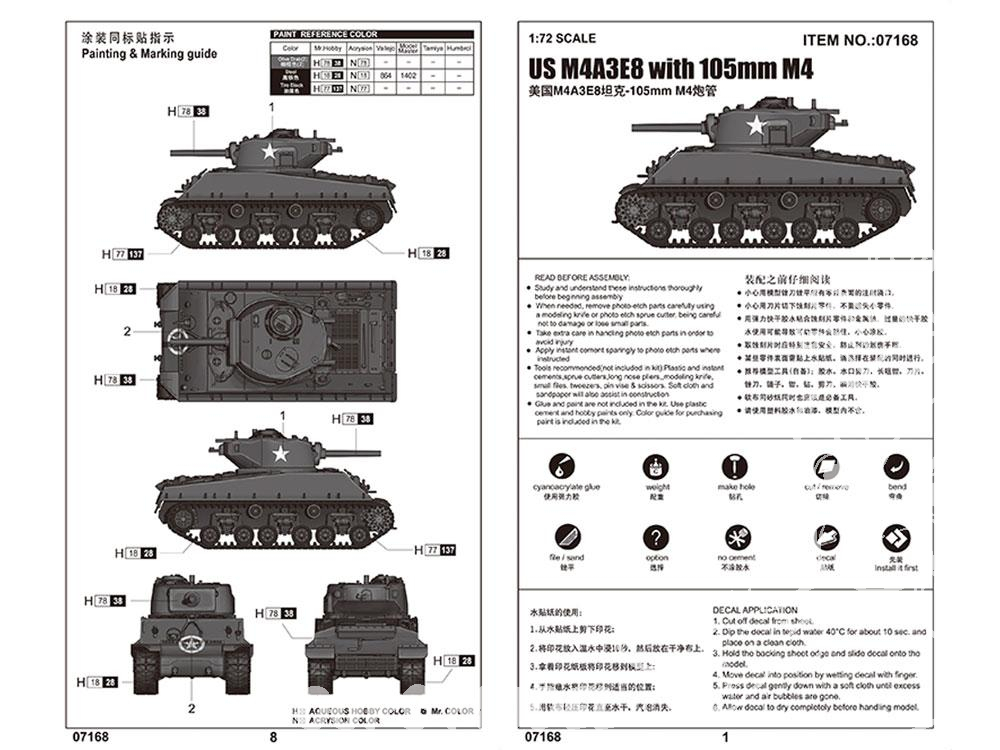 TRUMPETER maquette militaire 07168 US M4A3E8 SHERMAN AVEC CANON 105MM M4 1944 1/72