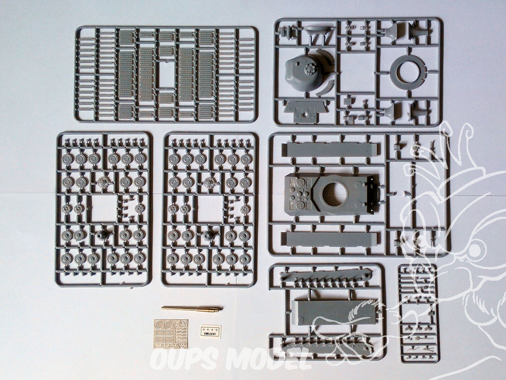 Bons points:Canon fourni en métal tourné,et accessoires du lot de bord séparés et une grande planche de marquages fournie.Chenilles fournies en section et maillons séparés(qui me paraissent quand même un peu fine pour la bestiole).