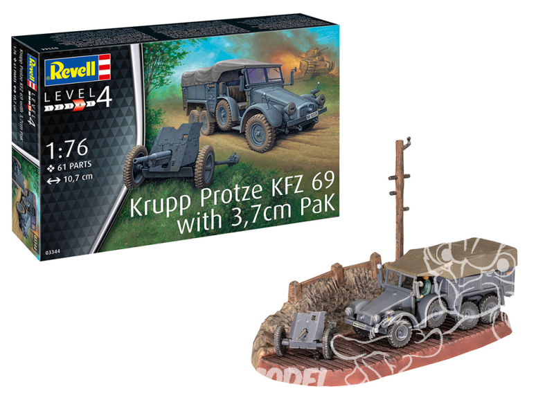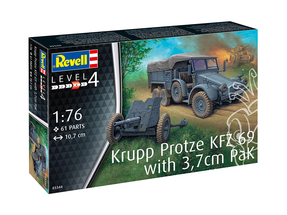 Kit de modélisme du véhicule léger Krupp Protze KFZ 69 avec canon anti-char de 3,7cm. Le véhicule possédait une charge utile de 1,5 tonne, était doté d'une transmission intégrale et atteignait une vitesse maximale de 70 km/h. Le canon anti-char de 3,7 cm avait une portée de 4 km environ.