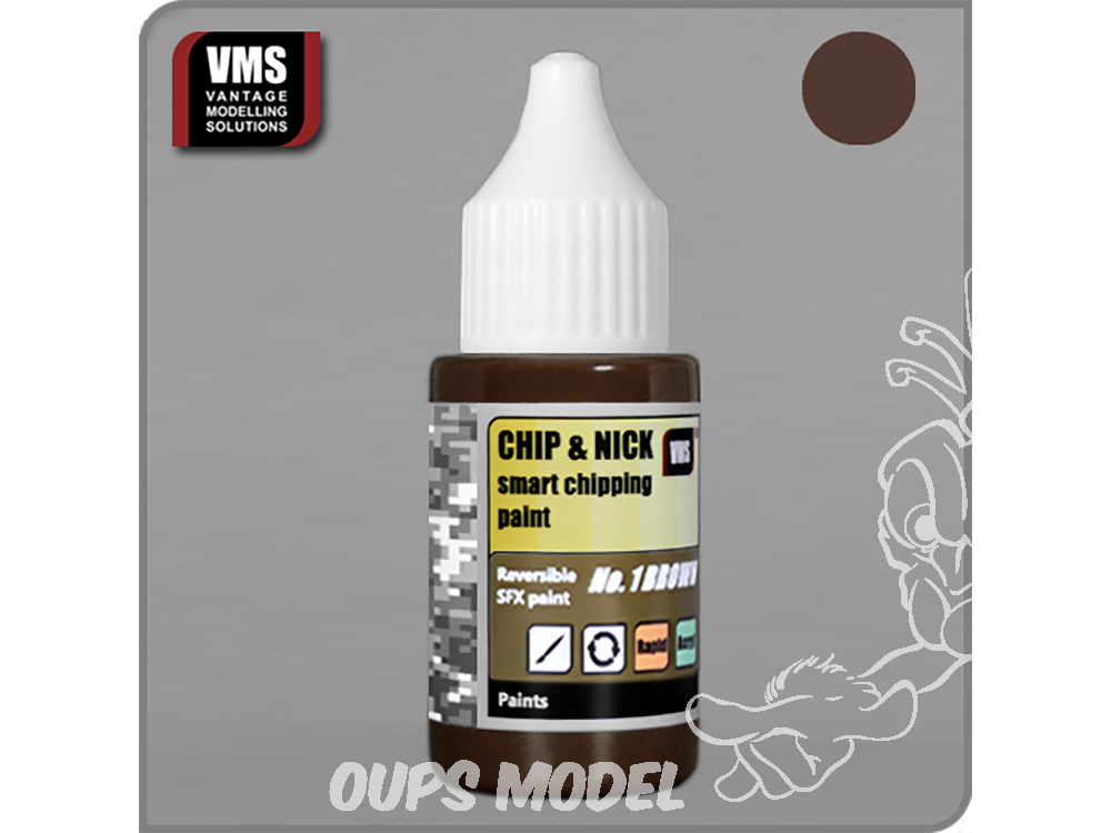 Chip & Nick est une peinture intelligente unique créée pour vous aider à créer des effets d'écaillage super réalistes sur votre modèle avec un minimum de compétence. La peinture fonctionne via la technique de «copiage inversé» VMS. Il suffit d'appliquer la peinture sur le modèle, puis d'en retirer des parties avec de sorte qu'il ne reste que des effets d'écaillage. Chip & Nick n'ajoute pas d'épaisseur à votre vieillissement, contrairement à la laque pour cheveux et aux liquides similaires, la peinture fond optiquement avec la base pour un résultat exceptionnel. La peinture est réversible - il n'y a pas de risque de mauvais écaillage car vous pouvez toujours enlever l'excès de peinture. Chip & Nick vous permet de créer des puces super fines qui étaient jusqu'à présent réservées à la technique du pinceau fin en une fraction du temps nécessaire et sans tracas. La peinture permet des effets d'écaillage multicolores tandis que les techniques de laque pour cheveux et les peintures «lavables» permettent une seule couleur en raison de leur manque de résistance à l'eau. IMPORTANT: Le produit est sensible aux basses températures et ne doit pas être congelé! Conserver et manipuler à température ambiante.